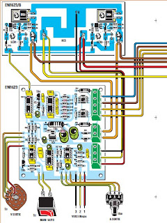 Comme le montre la figure 17, fixez, au fond du boîtier métallique, la platine 1 EN1623 (avec des entretoises métalliques à vis et écrous) et le gros transformateur d’alimentation (avec des boulons). Toutes les platines sont maintenant en place. Vous pouvez assembler (avec des vis) la face avant et le panneau arrière sur le corps du boîtier et procéder aux interconnexions entre les différents éléments. Pour cela,